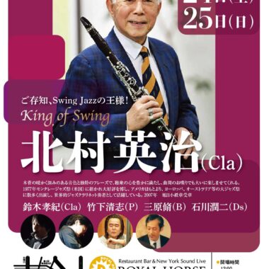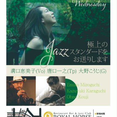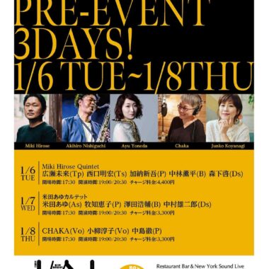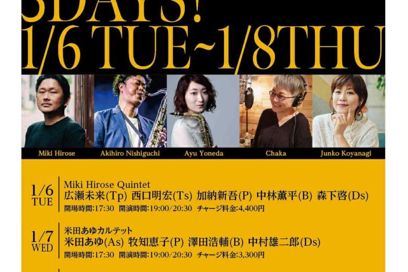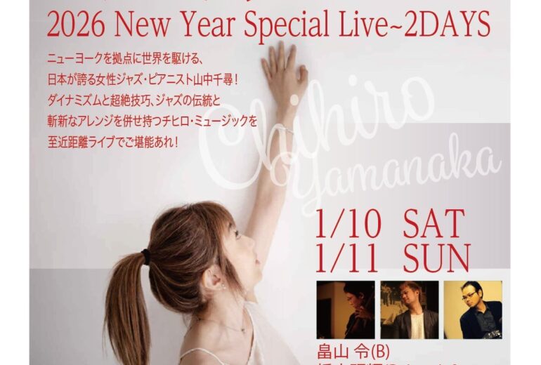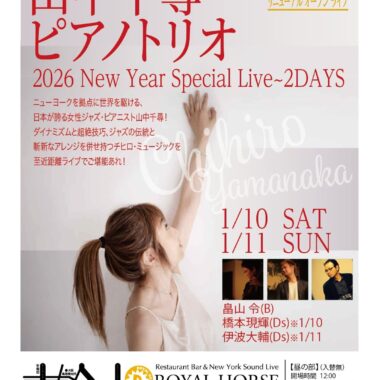 2026年1月7日(水) 開場時間:17:30 開演時間:19:00/20:30 チャージ料金:3,300円 米 田 あ ゆ (As) 牧 知 恵 子 (P) 澤 田 浩 輔 (B) 中 村 雄 二 郎 (Ds) 予約フォーム 日程・人数・時間必須 人数 時間 10:0010:3011:0011:3012:0012:3013:0013:3014:0014:3015:0015:3016:0016:3017:0017:3018:0018:3019:0019:3020:0020:3021:0021:3022:0022:3023:0023:3024:00 メールアドレス必須 お名前必須 ふりがな必須 お電話番号任意 ご要望任意 【プライバシーポリシー】 royal-horse.jp(以下「本サイト」と言います。)を運営する有限会社ロイヤルホース(以下「弊社」と言います。)は、ユーザーの皆様の個人情報を最大限保護すべく、以下の規約を遵守致します。 個人情報の保護... 個人情報収集... 個人情報の利用... 個人情報の開示... ユーザーによる照会... ポリシーの改善... 個人情報の取扱いについて、同意します ROYAL HORSE PRE-EVENT 3DAYS! Miki Hirose Quintet (2025 1 / 6 ・火曜日) 前の記事 ROYAL HORSE PRE-EVENT 3DAYS! (2025 1 / 8 木曜日) 次の記事